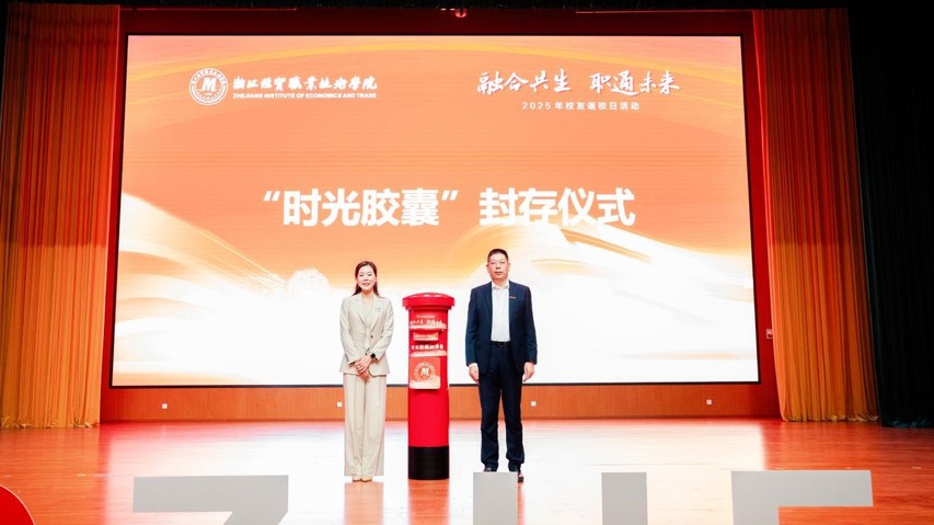 在充满仪式感的“时光胶囊”封存环节,陈德泉与2005届电子商务专业校友代表林旭微共同登台,将满载着校友们手写心愿的“时光胶囊”郑重封存。一张张精美的明信片上,既有对课堂专注求知、实训场上挥汗如雨、同窗相伴欢声笑语的鲜活追忆,更有对母校学科建设、人才培养、事业发展的深切期许,字里行间满溢着“经贸人”对这片育人沃土的赤子之心与眷恋之情。